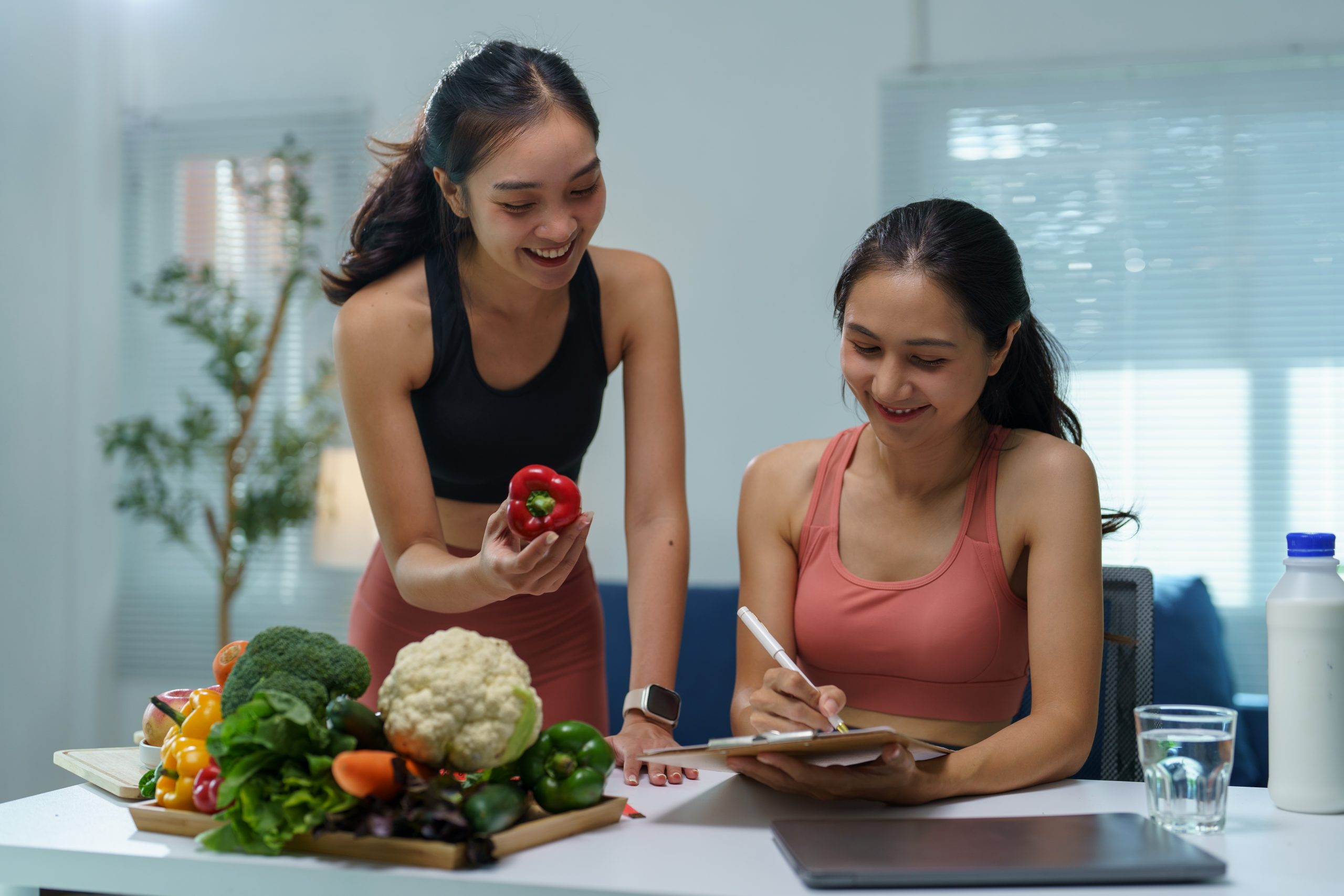 Two young women discussing a diet plan in a kitchen, with a nutritionist holding a red bell pepper and a client taking notes, surrounded by fresh vegetables